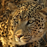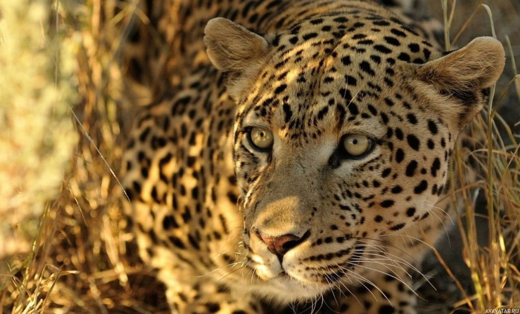 На снимке изображен леопард в его естественной среде обитания. Кажется, что он сидит или стоит среди сухой травы, возможно, на саванне. Леопард обращен к камере с сосредоточенным и внимательным выражением лица.