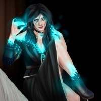 dark hair, wearing a black outfit, and has blue magical energy emanating from her hand as she casts a spell. The artwork captures