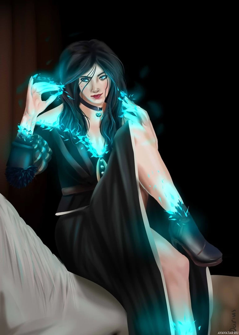 The image shows an illustration of a character who appears to be Yennefer from the "The Witcher" series. She is depicted with