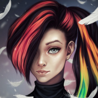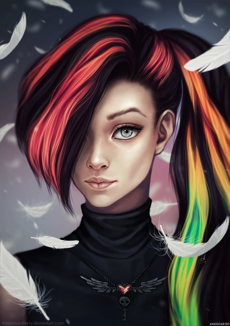 a black top or jacket, and there are white feathers scattered around her head, giving a whimsical feel to the overall image. On the right side of her neckline, there's