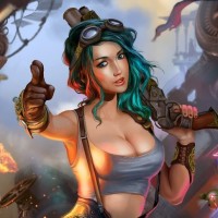 a bullet belt around her waist and is holding a weapon with both hands, pointed outward as if she's aiming or firing at something not shown in the image. The background is detailed, depicting an industrial or post-apocalyptic setting with machinery that appears to be from an earlier time period, possibly World