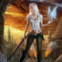 an intense sky suggesting either sunrise or sunset, and there are ruins that could imply a post-apocalyptic or mythical scene. In her left hand, she holds