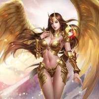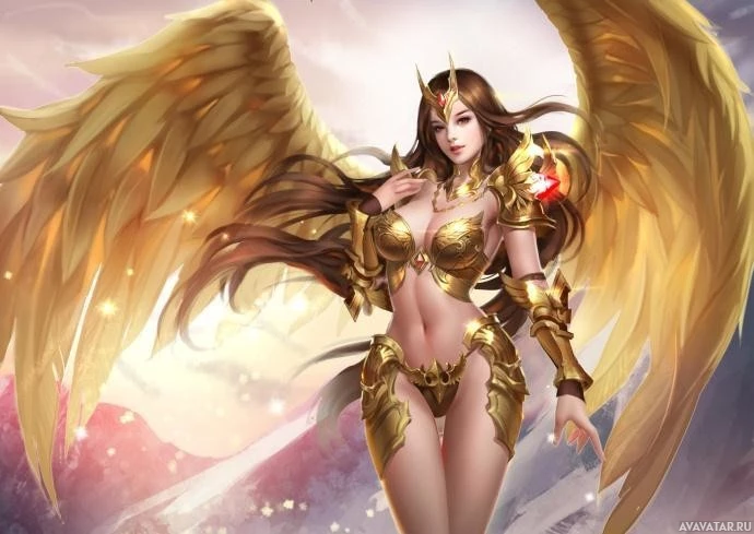 a female character with fantasy elements, commonly referred to as an angel due to her winged appearance. She is wearing a gold and white