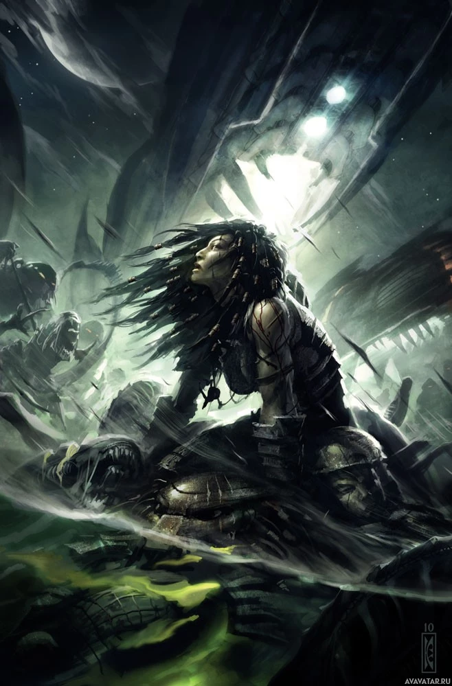 a desolate landscape, possibly a battlefield or aftermath of a disaster. In the background, there are strange creatures that could be interpreted as aliens or