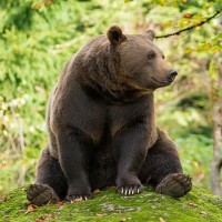 a brown bear, which is an animal commonly associated with forests and mountains. It appears to be resting or sitting on a rock, surrounded by trees that have autumn foliage, indicating it could be in