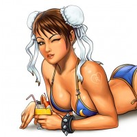 fighter in the game. She is depicted lying on her back and wearing a bikini with a peace sign