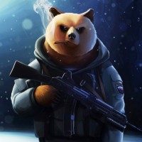 a stern expression on its face. The bear is holding a gun with both hands, indicating it may be ready for combat or some