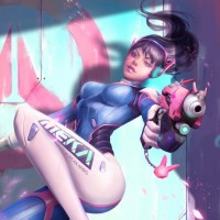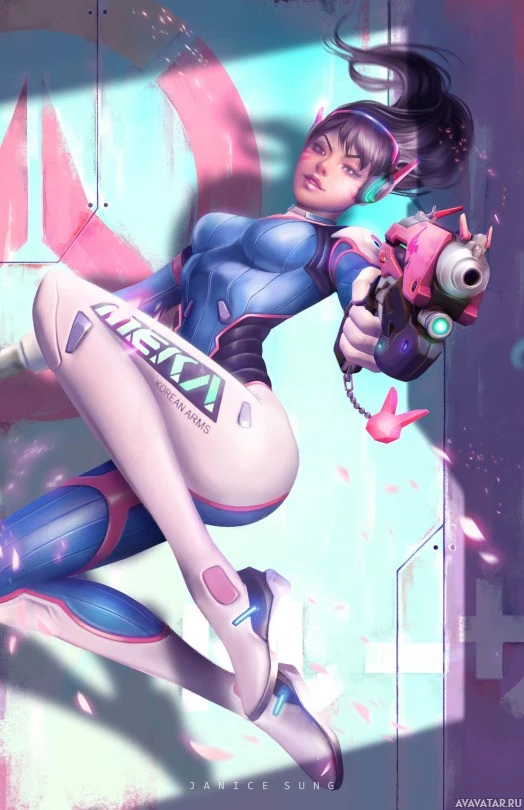 long hair and glasses, wearing a suit with the label "D.VA" on it. She is holding what seems to be a gun in her hand, which is a part of her character's design from