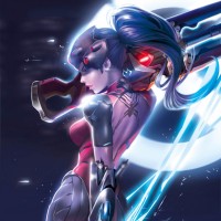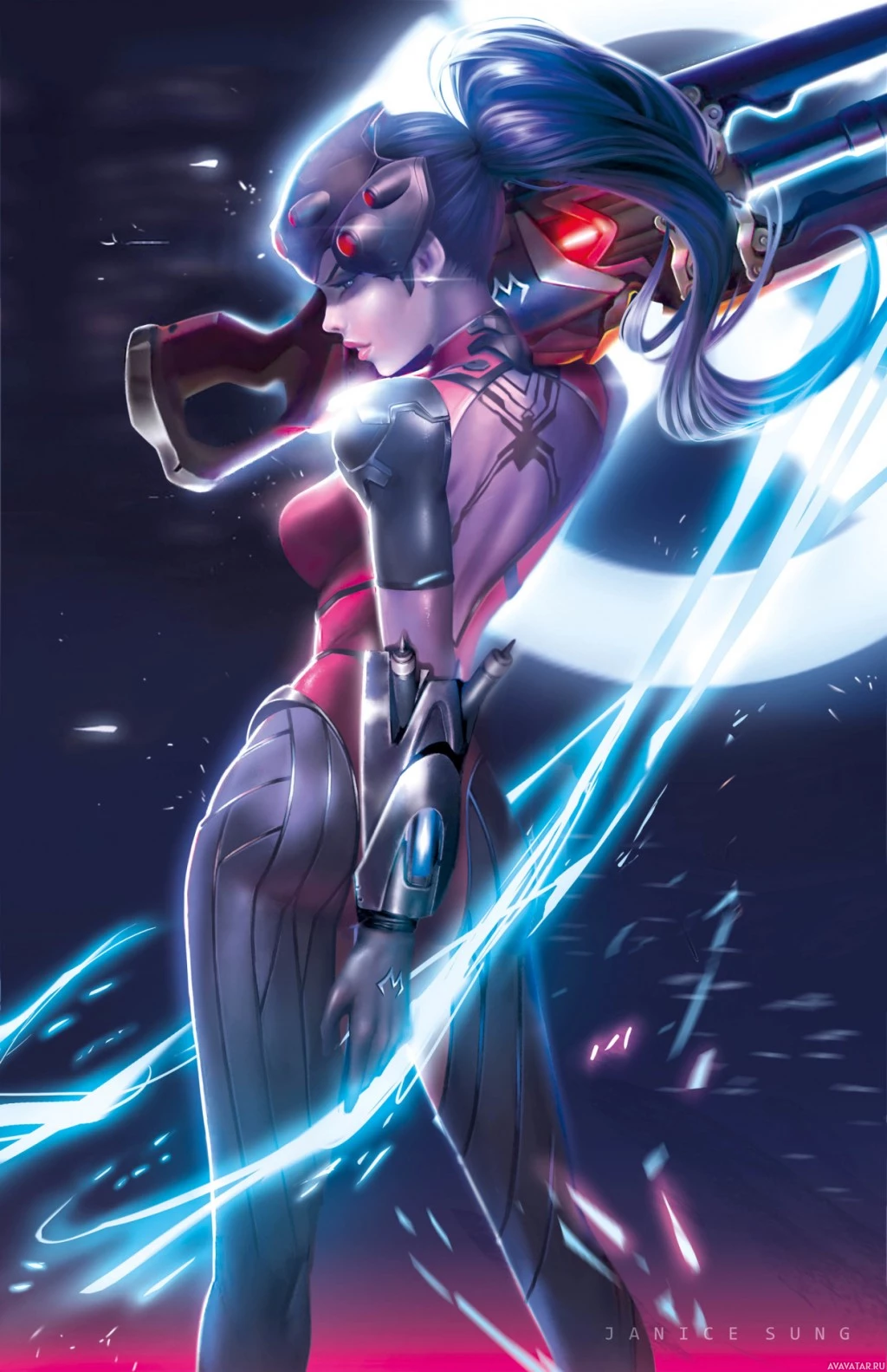 the video game Overwatch. She is depicted from behind, showing off her back and shoulders with