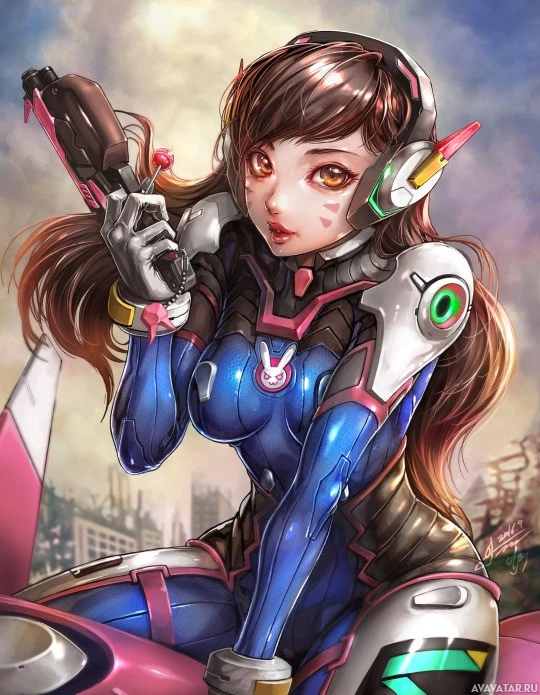 Изображение изображает анимированного персонажа, который выглядит как D.Va из видеоигры «Overwatch». Она показана с игривым выражением, держа в руках то, что кажется ее надежным мех-костюмом, что является ключевой особенностью ее персонажа в игре.