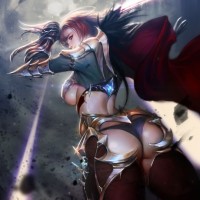 female character wearing armor and holding a sword. She appears to be in the midst of battle, as suggested by