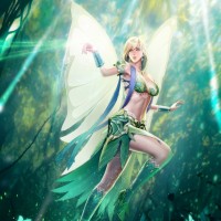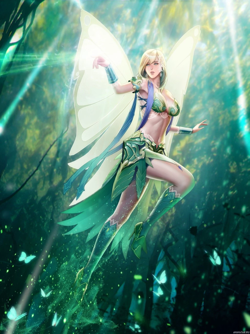 a mystical forest, with trees and greenery surrounding her. There's also the presence of butterflies or similar flying insects in the background, which enhances