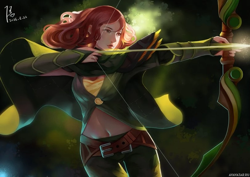 an action pose, drawing back her bow and arrow to fire them. The art style is detailed and vibrant, highlighting the character's features and attire which are characteristic of fantasy-themed games like Dota 2.