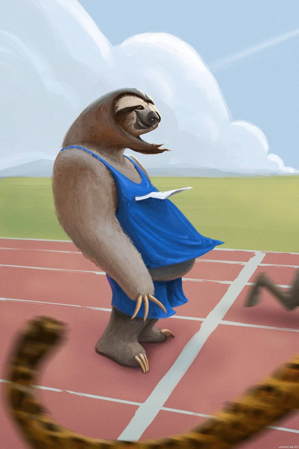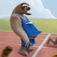 an animated sloth wearing a blue tracksuit and sneakers, participating in a race. The sloth is depicted with human-like characteristics such as
