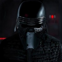 The image features a character from the Star Wars franchise. He is wearing a helmet that has become iconic to this character, known as Kylo Ren. His expression seems contemplative or serious.