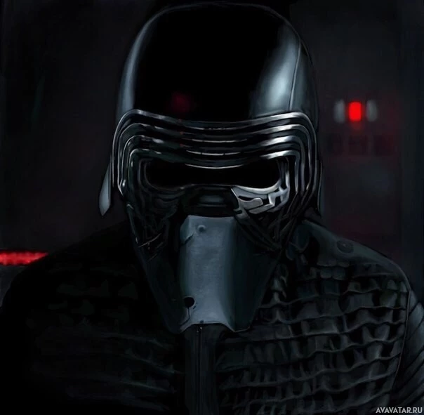 На изображении изображен персонаж из франшизы «Звездные войны». Он носит шлем, который стал культовым для этого персонажа, известного как Кайло Рен. Его выражение кажется созерцательным или серьезным.
