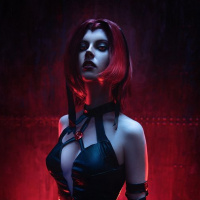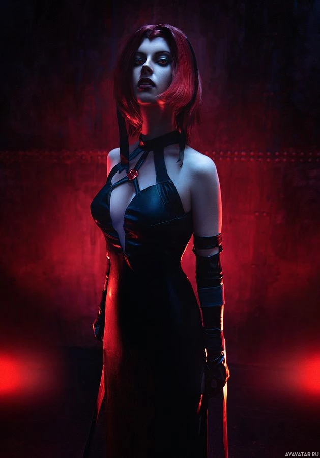 video games. The individual is wearing a black corset dress with red accents, which resembles the outfit worn by the character in