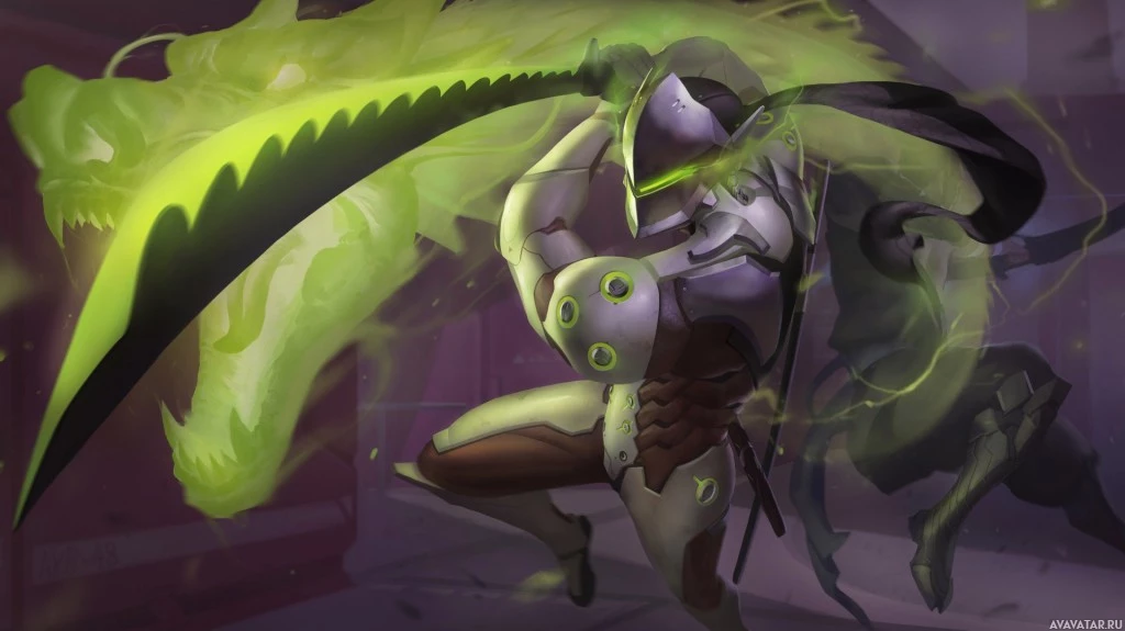 the video game "Overwatch." The character is depicted with green and yellow