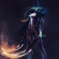 pointed ears, dark clothing, and wielding two curved swords. The background suggests a nighttime setting with rain, enhancing