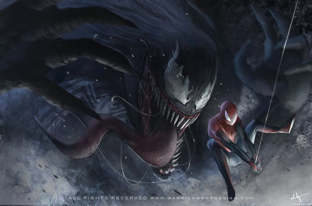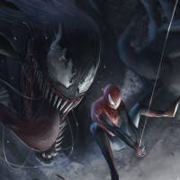 The image features two characters: Spider-Man and Venom. They are shown in a dynamic, almost superhero-style pose against