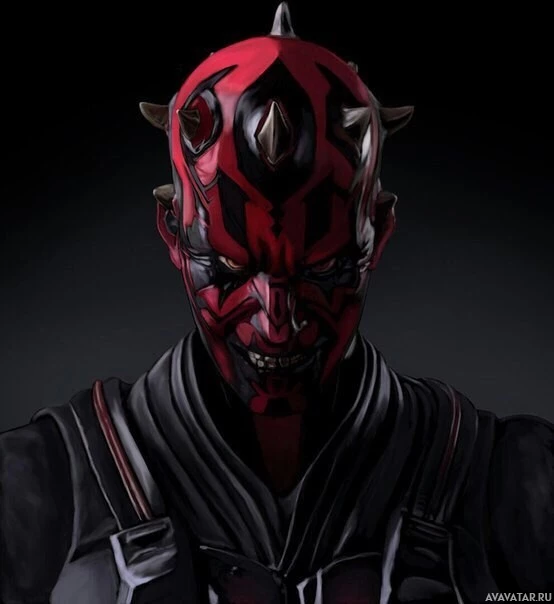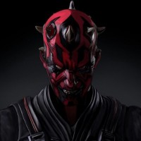the Star Wars franchise. He is recognizable by his distinctive red and black face, with horn-like structures on either side of his head. He's wearing