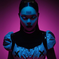 blue design that matches the overall color scheme. The person is looking directly at the camera, exuding an intense and confident demeanor. The lighting highlights their features and adds