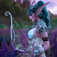 turquoise hair and is holding a bow with a string made of what appears to be real feathers or small flowers. Her attire includes intricate detailing, suggesting she may have