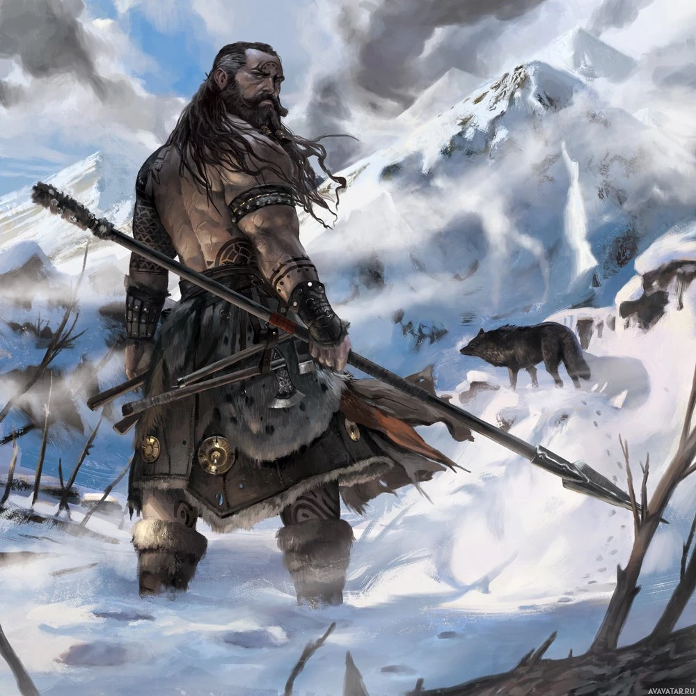 fantasy armor that suggests a barbarian or Viking-like attire, complete with a helmet and what appears to be a fur cloak. In one hand, he holds a lance, while in the other hand, he is holding a shield. The background features snow-covered mountains under