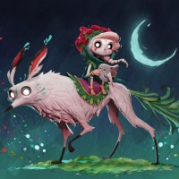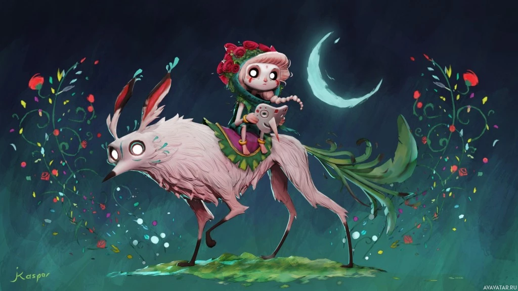 long legs. The background includes stylized elements such as flowers and stars, contributing to a magical or fairy-tale atmosphere. There's also