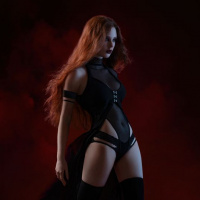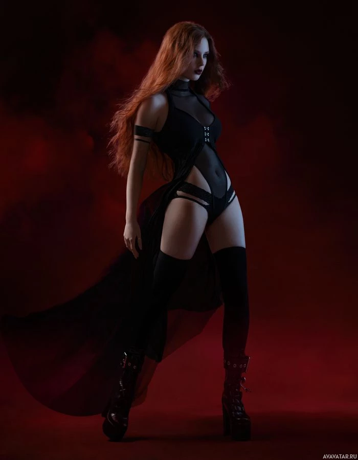 a dynamic pose with one leg raised and the other on the ground. They are wearing black and red attire that appears to be a costume or fashion-forward outfit, with elements like thigh