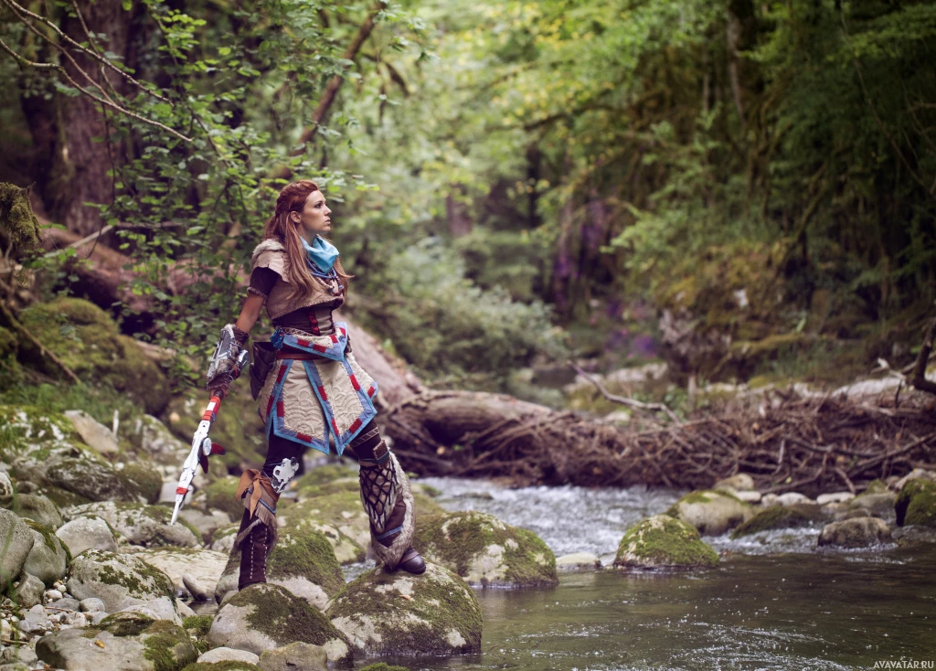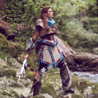 a forested area. The individual appears to be wearing cosplay attire that resembles outfits from the game "Horizon