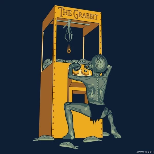 skeletal figure, sitting in front of a game console that is labeled "The Grabber." The character's hands are inserted into the machine as if they are attempting to interact with it. The style of the image is reminiscent of Middle-earth, and it could be associated with Gollum due to his iconic presence in the Lord of