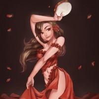 a red dress with a frilly design, and she appears to be dancing. She has her arms extended above her head and is holding what looks like a fan or