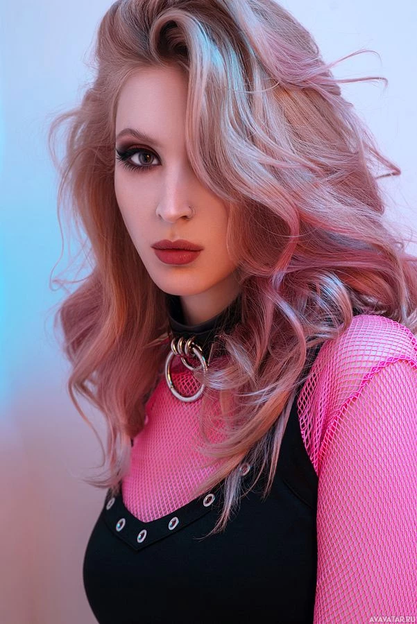 blonde hair with pink highlights and makeup that includes dark eyeliner and lipstick. The woman is wearing
