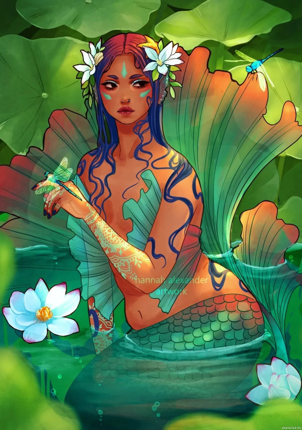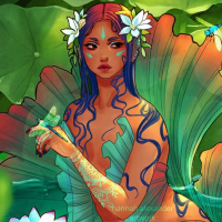 blue hair and is adorned with flowers in her hair, suggesting a connection to nature or perhaps being part of the aquatic realm. She is seated on lily pads within