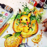 vibrant colors and seems to convey a cheerful, summery theme, possibly representing a "Pokemon"-themed drink or a character enjoying a refreshing treat.