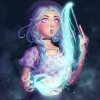 moody atmosphere that contrasts with the bright light emanating from her hand, suggesting she might be performing some sort of magical trick or power. This image is likely related to