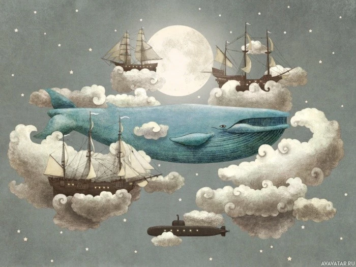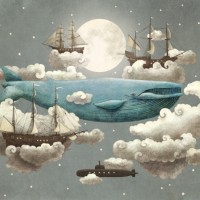 a ship sailing. This image combines elements of reality (a whale and ships) with fantasy (the whale flying) and creates