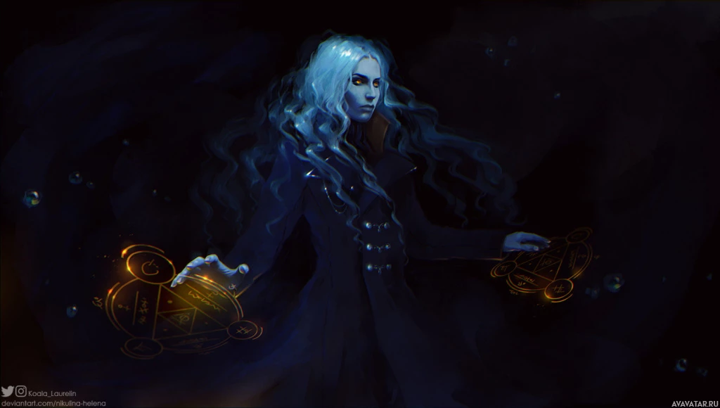 The image features a figure that appears to be a witch or sorcerer. This character has long, flowing