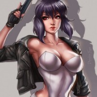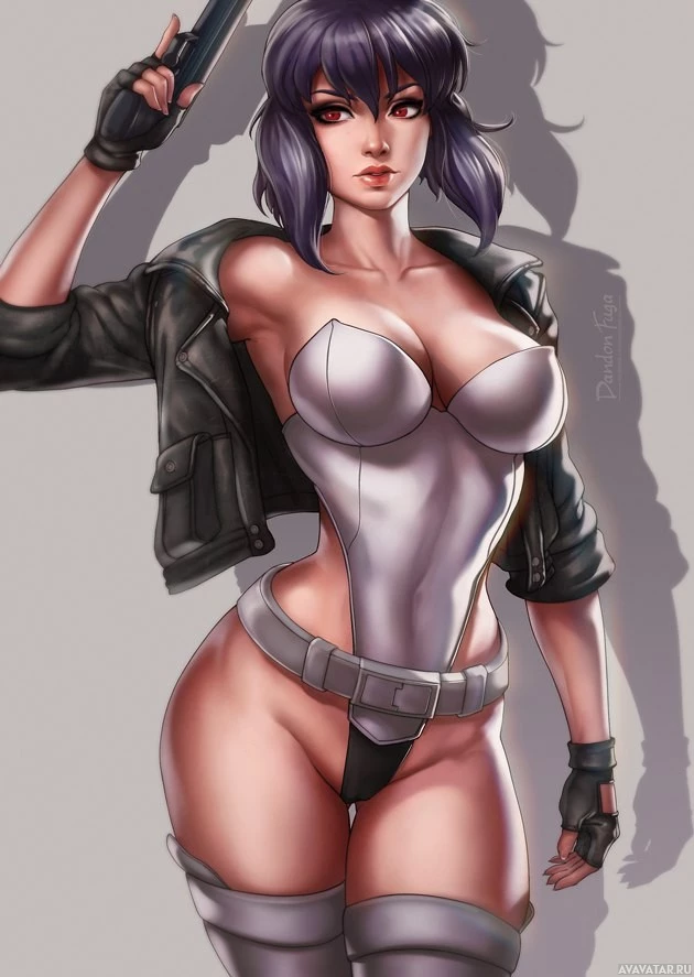 purple hair, a serious expression, and is wearing a tight-fitting bodysuit that resembles a powered suit with a high collar and sleek design. Her left hand is holding a pistol pointed towards her right side, suggesting she is either ready to shoot or showing off her weapon. There are also some