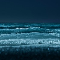 ocean scene at night. There are waves visible with white caps, indicating that the sea is choppy or breaking. The sky above the water is black, suggesting it could be during the evening or nighttime when there is