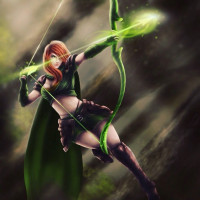 green suit. She is shown with a bow and arrow, suggesting her role as