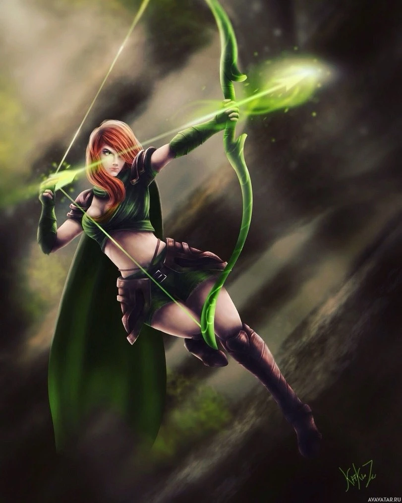 The image shows an illustration of a character from the game Dota 2. This character is known as Windranger, and she appears to be depicted in her