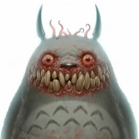 sharp teeth, which are not typical for Ghibli characters known for their cute appearances in films like "My Neighbor Totoro" or "Spirited Away." The style of the illustration is reminiscent of an animated horror movie or a ghastly creature from