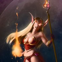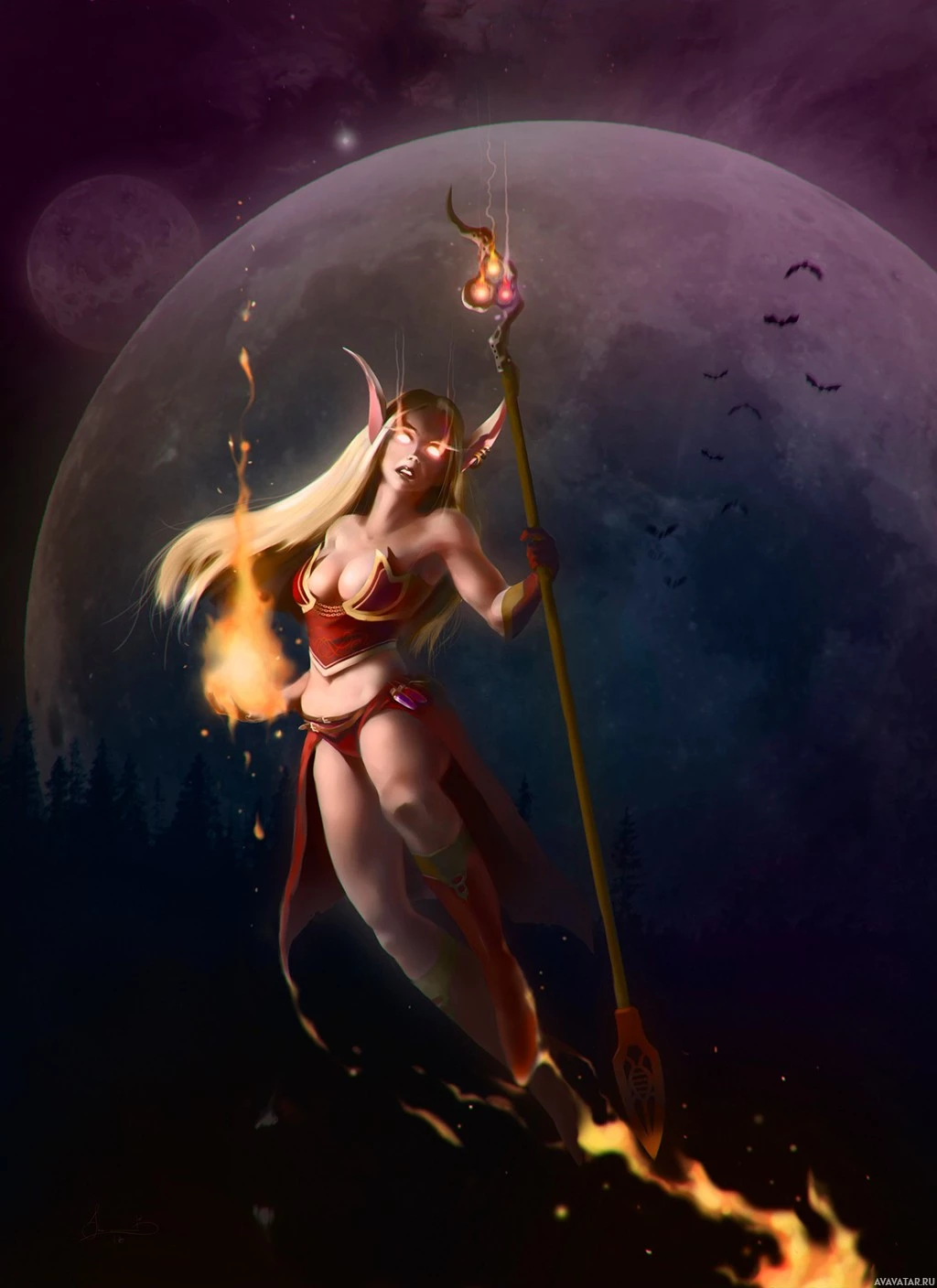 pointed ears, which is a common characteristic in fantasy art representing elves. They are holding what appears to be a wand or staff that emits flames. The background includes a full moon and