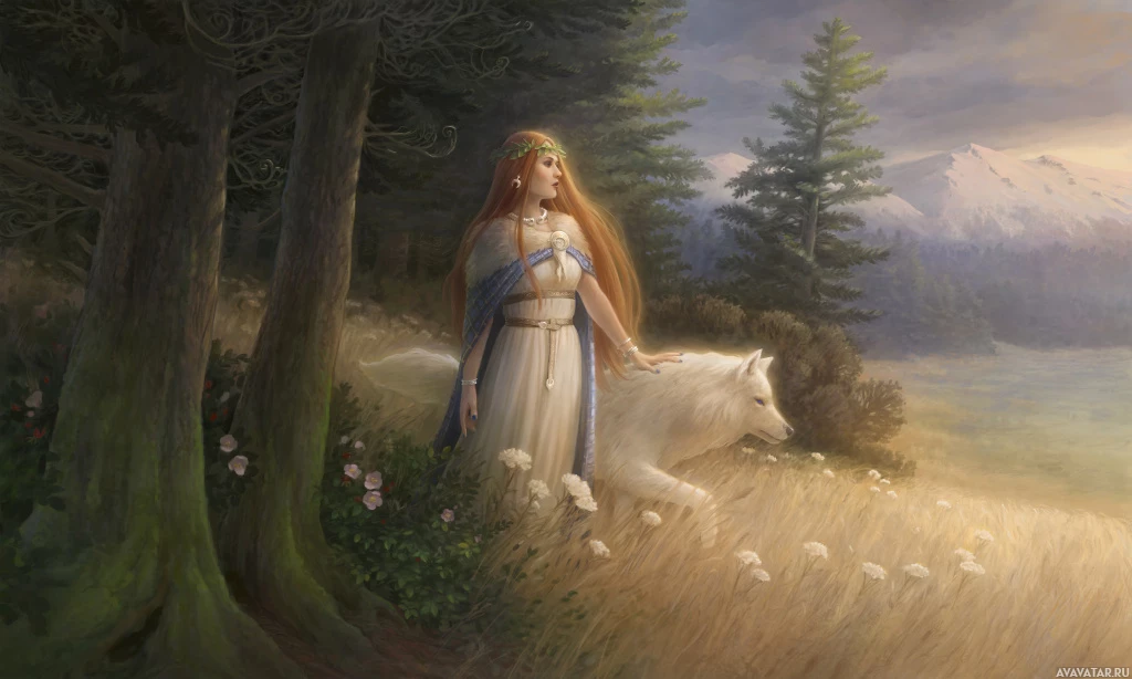 tall trees and there's a tranquil atmosphere to the image, with a subtle hint of a wolf-like creature resting peacefully on the left side of the frame. The lighting suggests it might be dusk or dawn due to