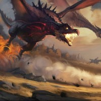 a fierce dragon with red scales and flames coming out of its mouth. The sky appears to be cloudy or possibly at dusk, suggesting an intense