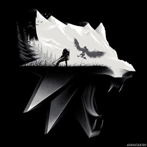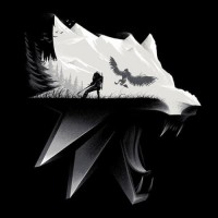 creature in the series as it represents the protagonist, known as "The Witcher." In the background, there is a mountainous landscape and a character that could be another