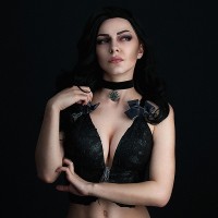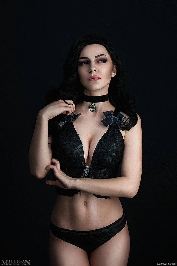 sensual vibe of the photo. Her attire and pose are reminiscent of the character Yennefer from