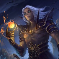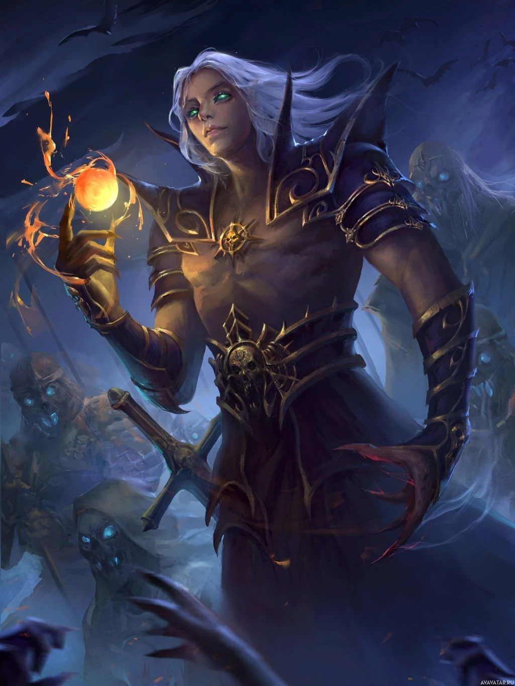 white hair and pointed ears, dressed in elaborate armor that resembles a mix of dark and light colors. This character has a cape, is holding a staff with